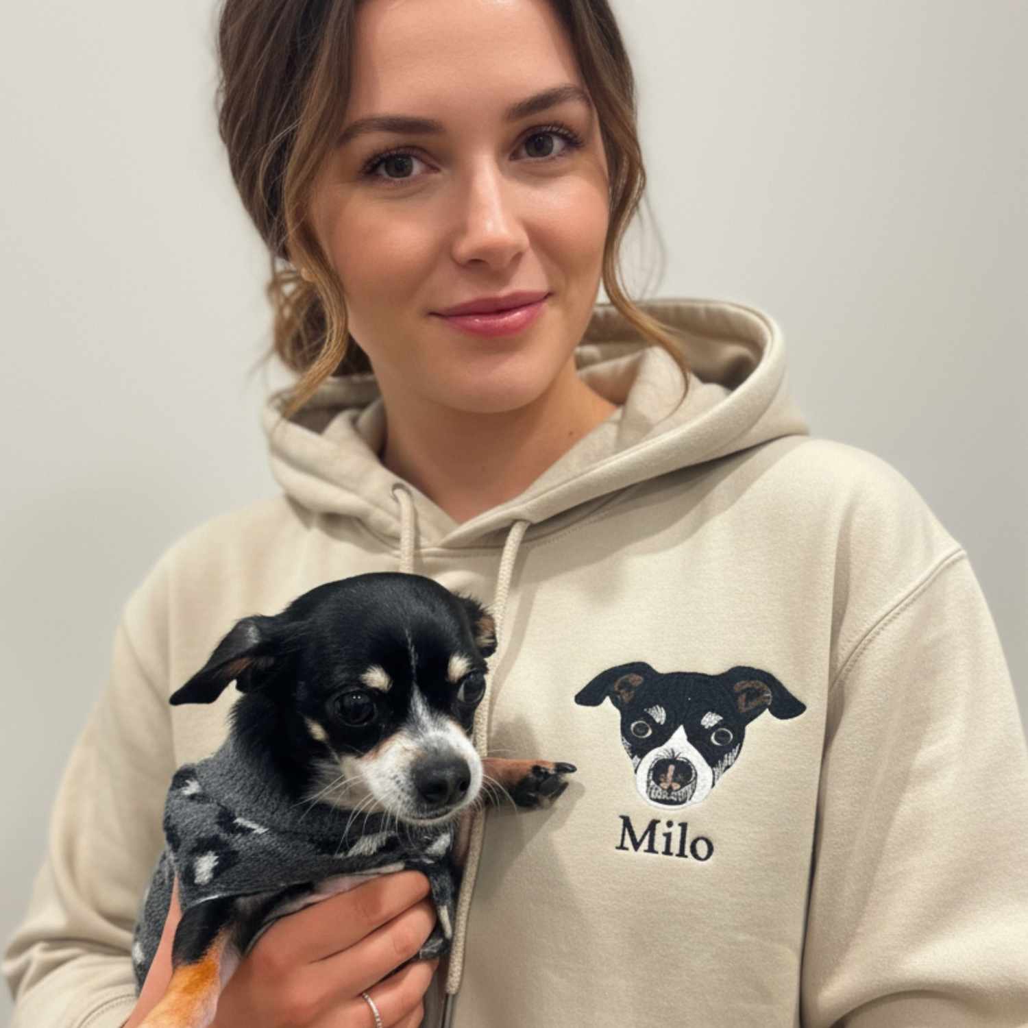Sweat-shirt personnalisé. Portrait brodé de votre animal réalisé à partir de votre photo avec des couleurs profondes et lumineuses pour un résultat unique
